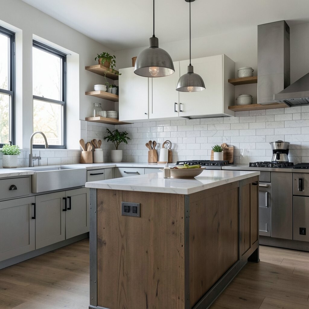 Industrial kitchens feel cool, strong, and a little urban. Think metal stools, dark lights, open shelves, and finishes that show off wood, brick, or concrete.
