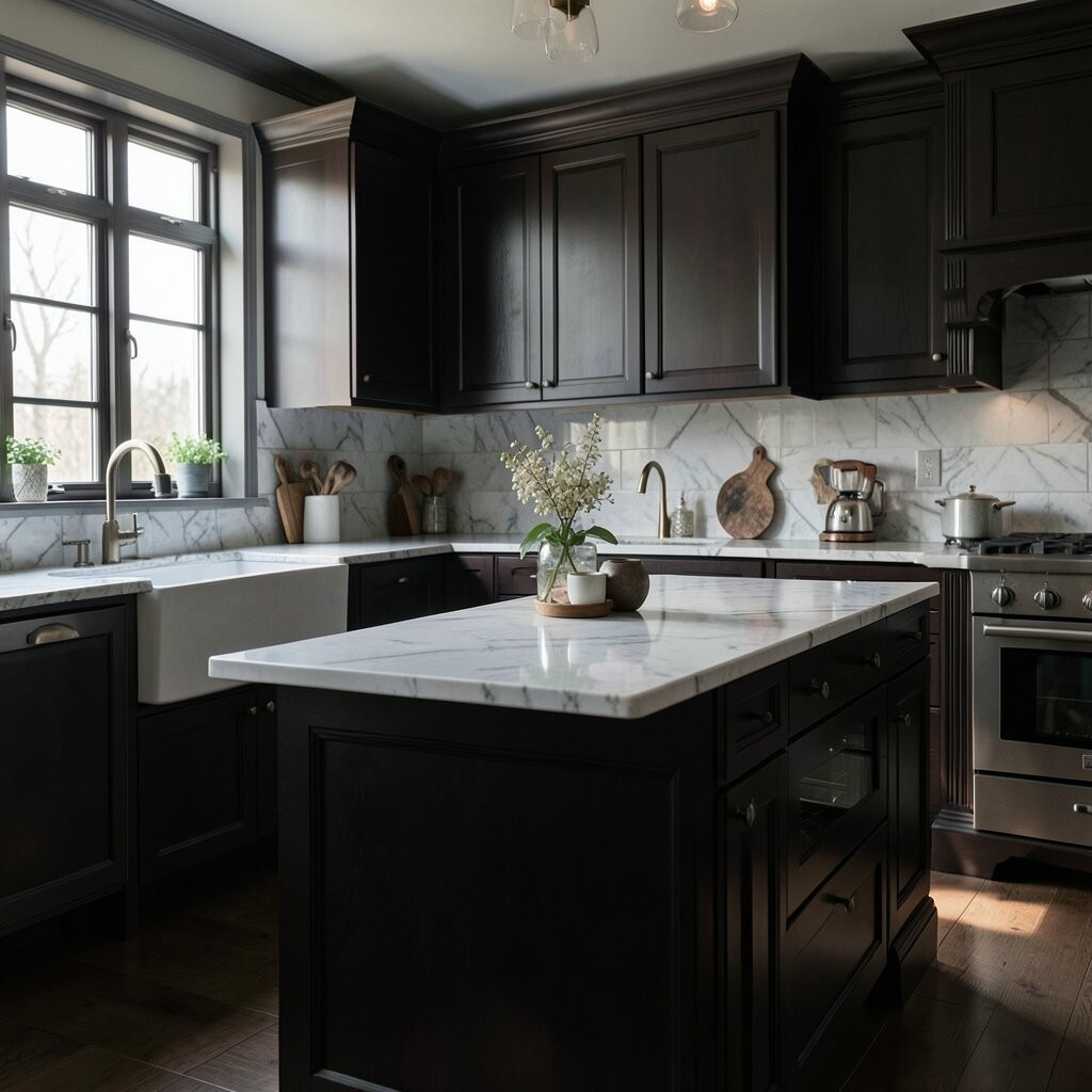 What makes it unique is the strong contrast. Brass handles, soft under-cabinet lights, and glass-front cabinets can keep the space from feeling too heavy.