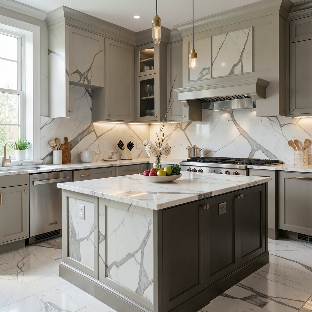 Marble glam kitchens feel rich, polished, and smooth. White or dark marble, shiny metal, and glass details create a fancy look that feels clean and classy.