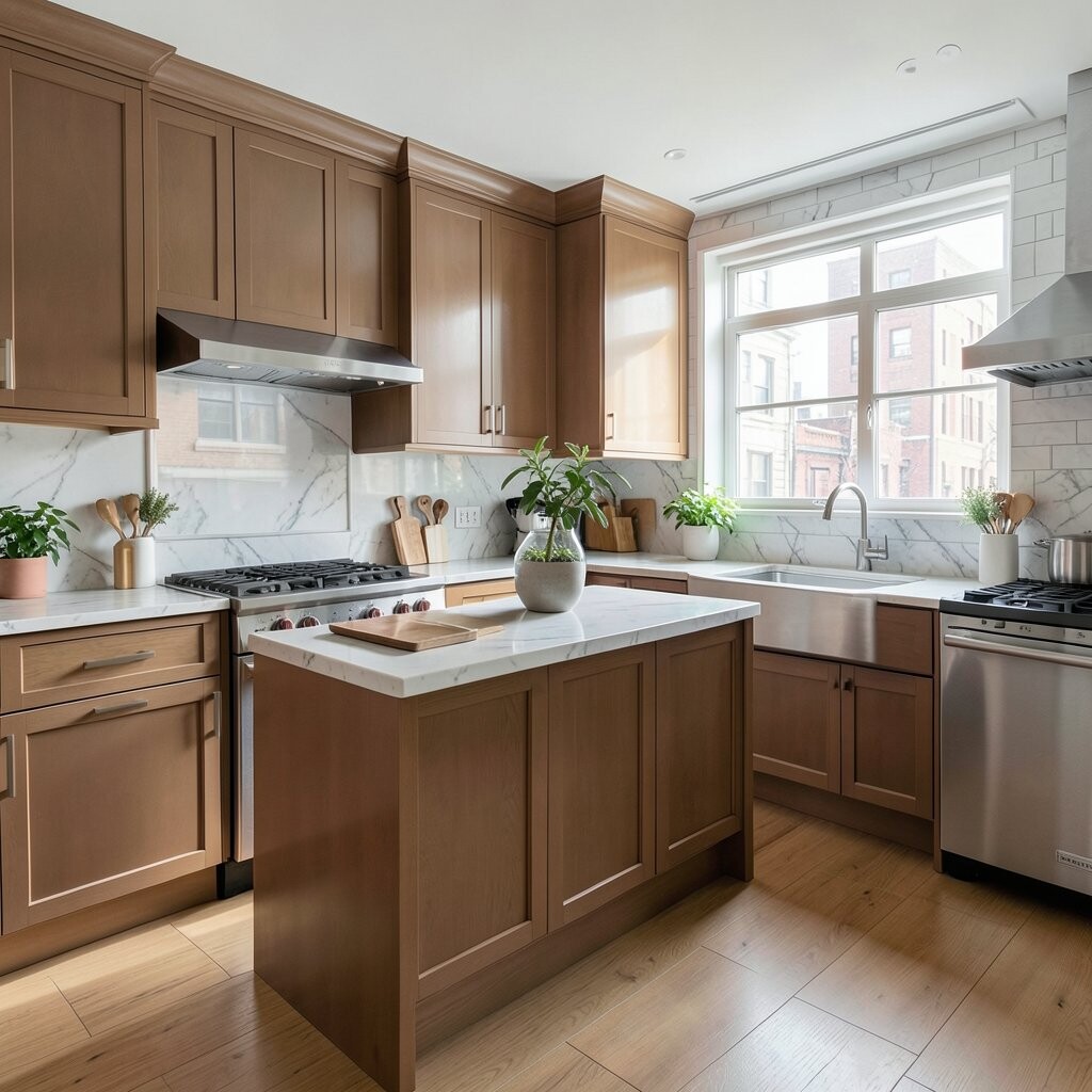 Walnut kitchens feel rich, cozy, and grounded. Deep wood tones bring warmth and make the room feel calm and inviting.