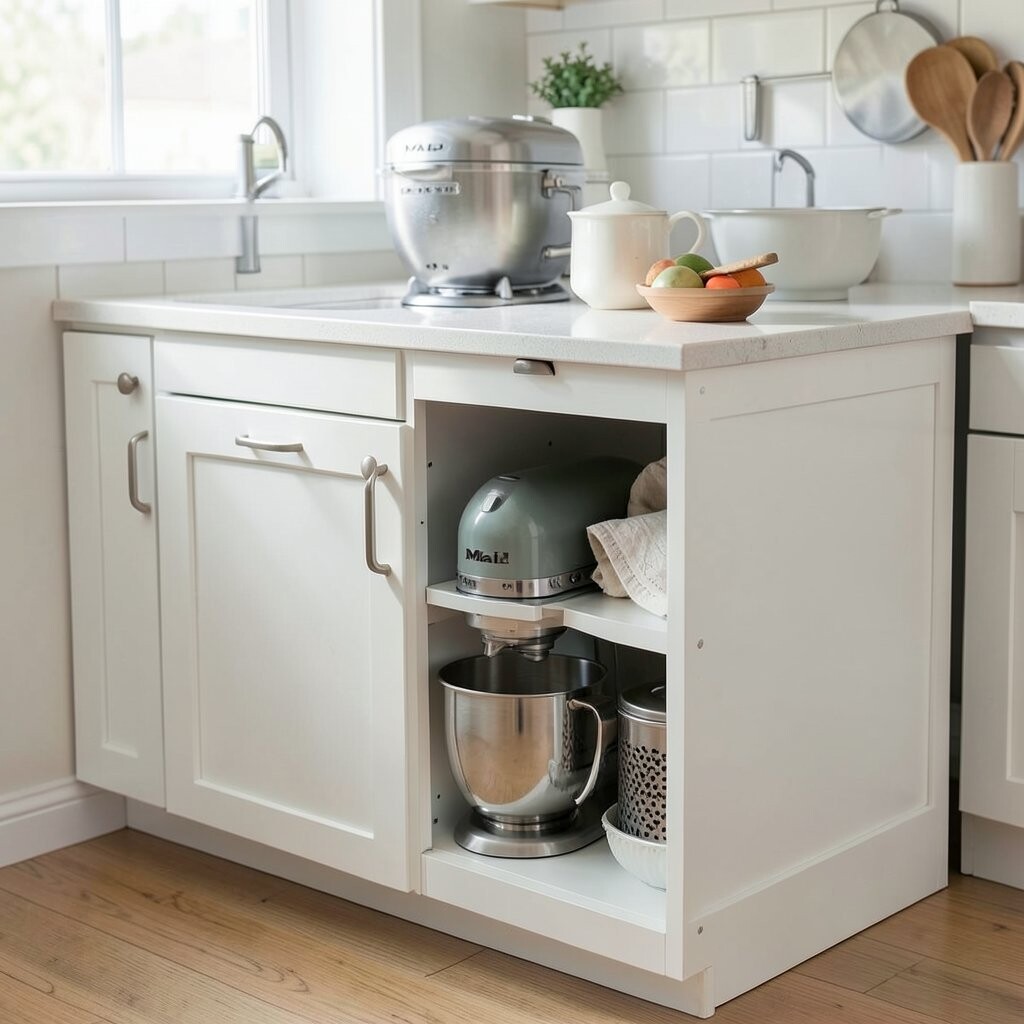 A mixer lift cabinet is a dream for anyone with a heavy KitchenAid. It hides the mixer away and brings it up only when you need it.