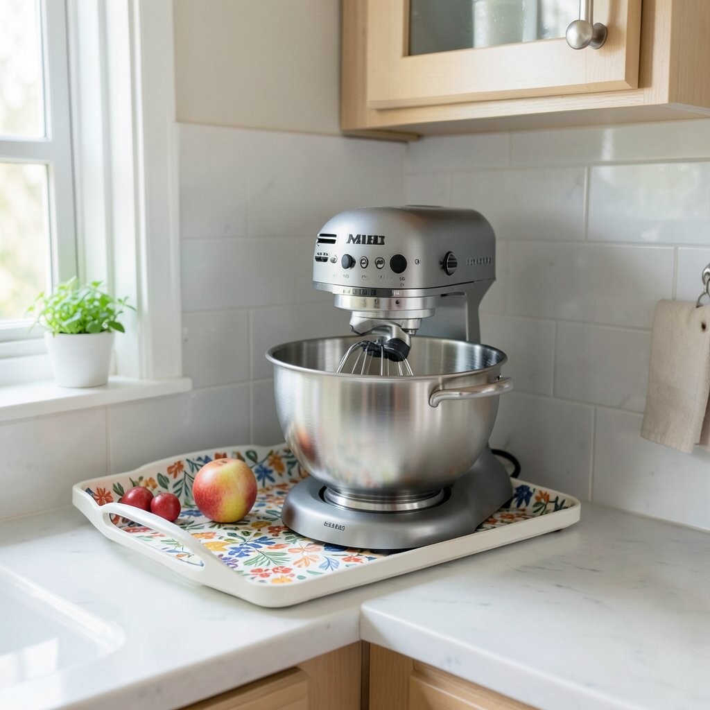 A decorative tray can make your mixer corner look pulled together. It gives your tools, cups, and small items one pretty place to sit.