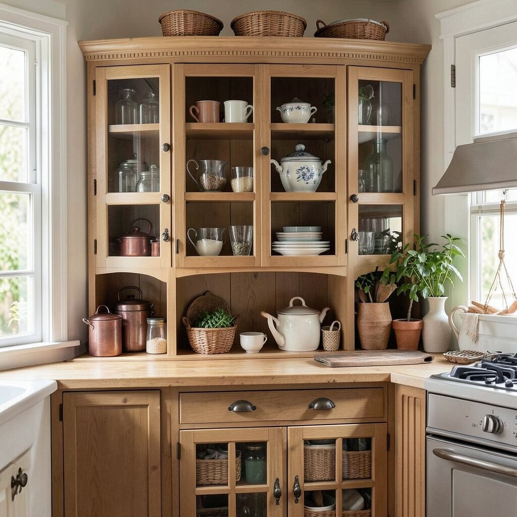 This style is nice for storing snacks, tea towels, bread, and extra kitchen tools. It feels homey and hides small messes in a pretty way.