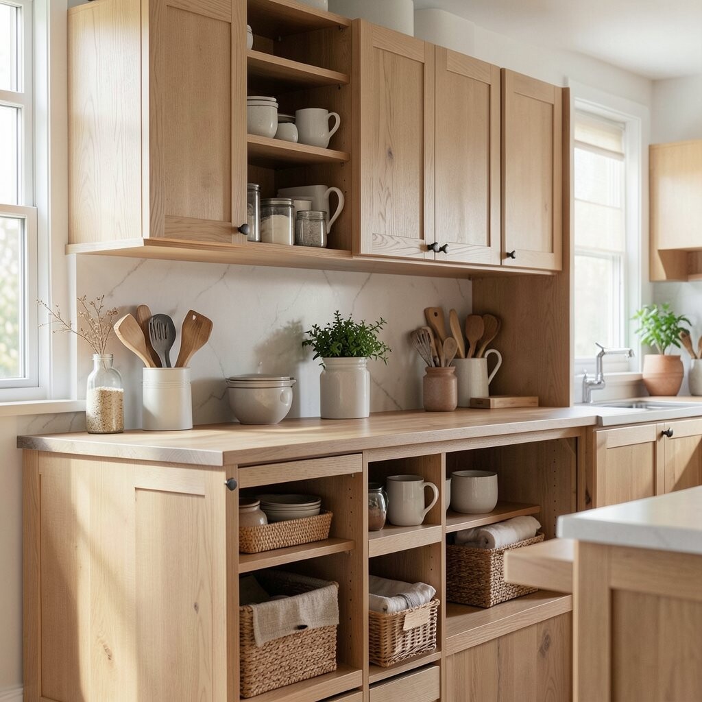 Natural wood warmth uses wood bins, trays, and shelf inserts to make cabinets feel cozy. The look is soft, earthy, and very inviting.