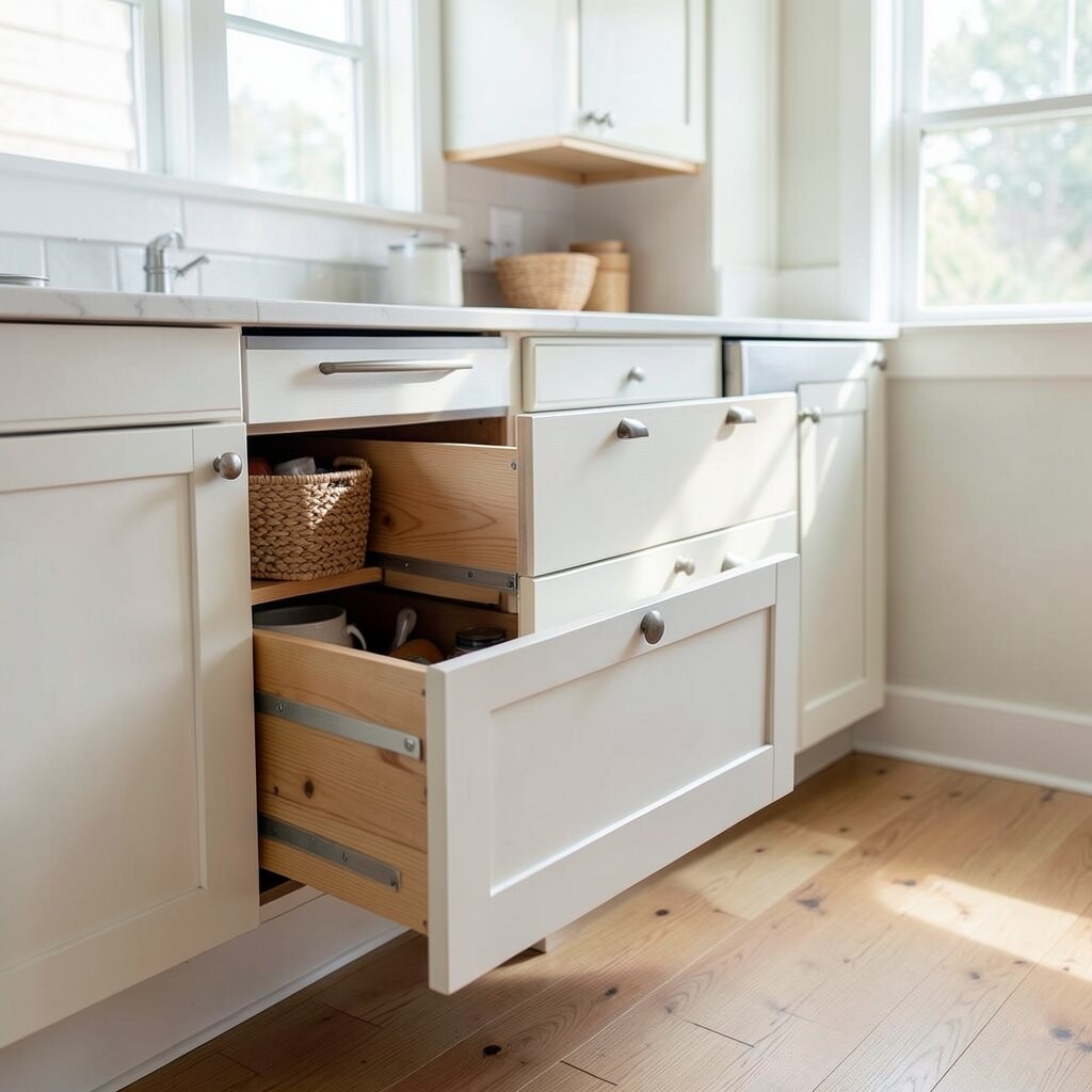 Drawer-first design puts deep drawers at the center of cabinet storage. It is a smart style because drawers make it easy to reach pots, pans, and heavy items.