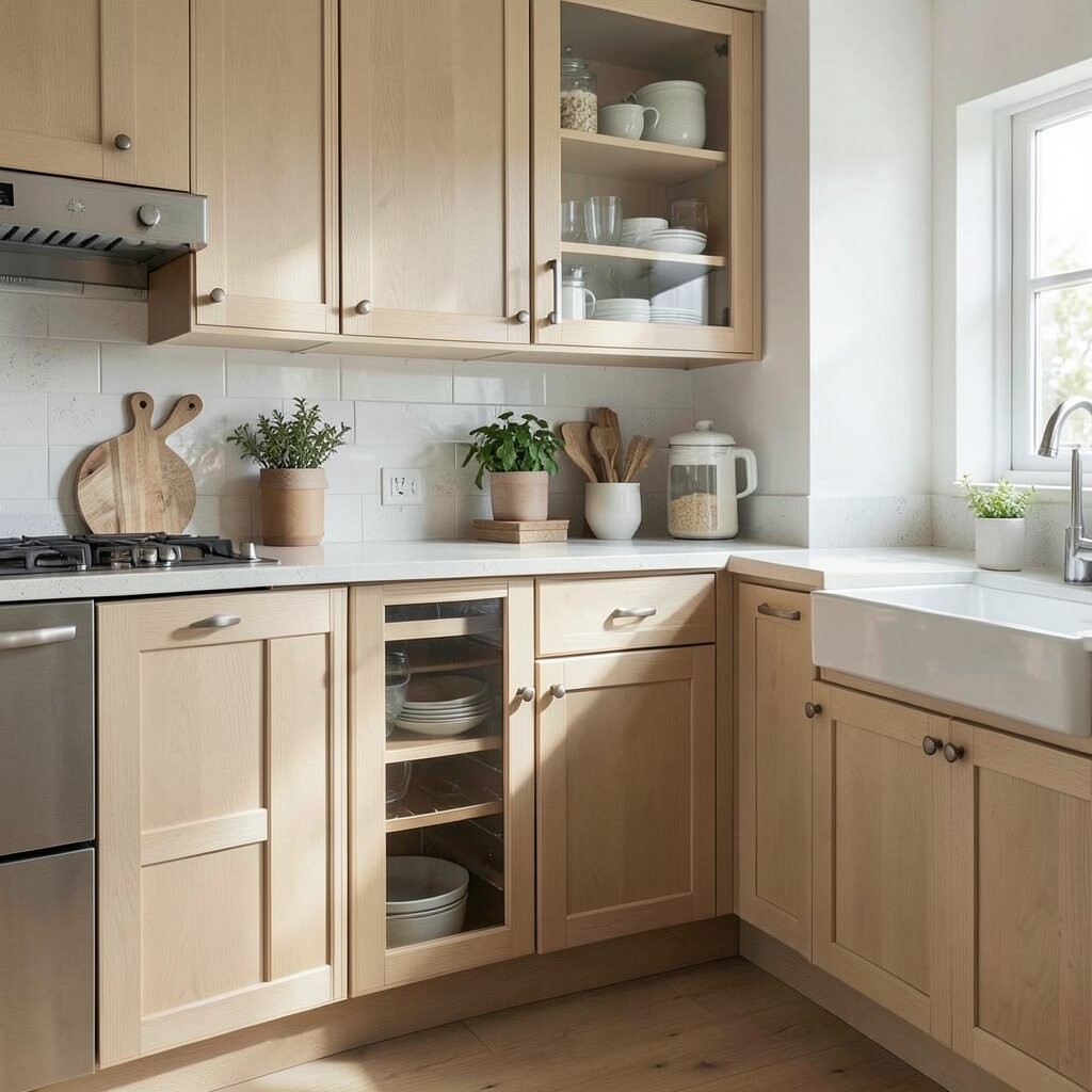 This style feels neat and fancy, but still warm if you fill it with pretty dishes, jars, and bowls. It works well in small kitchens because the open look keeps things from feeling heavy.