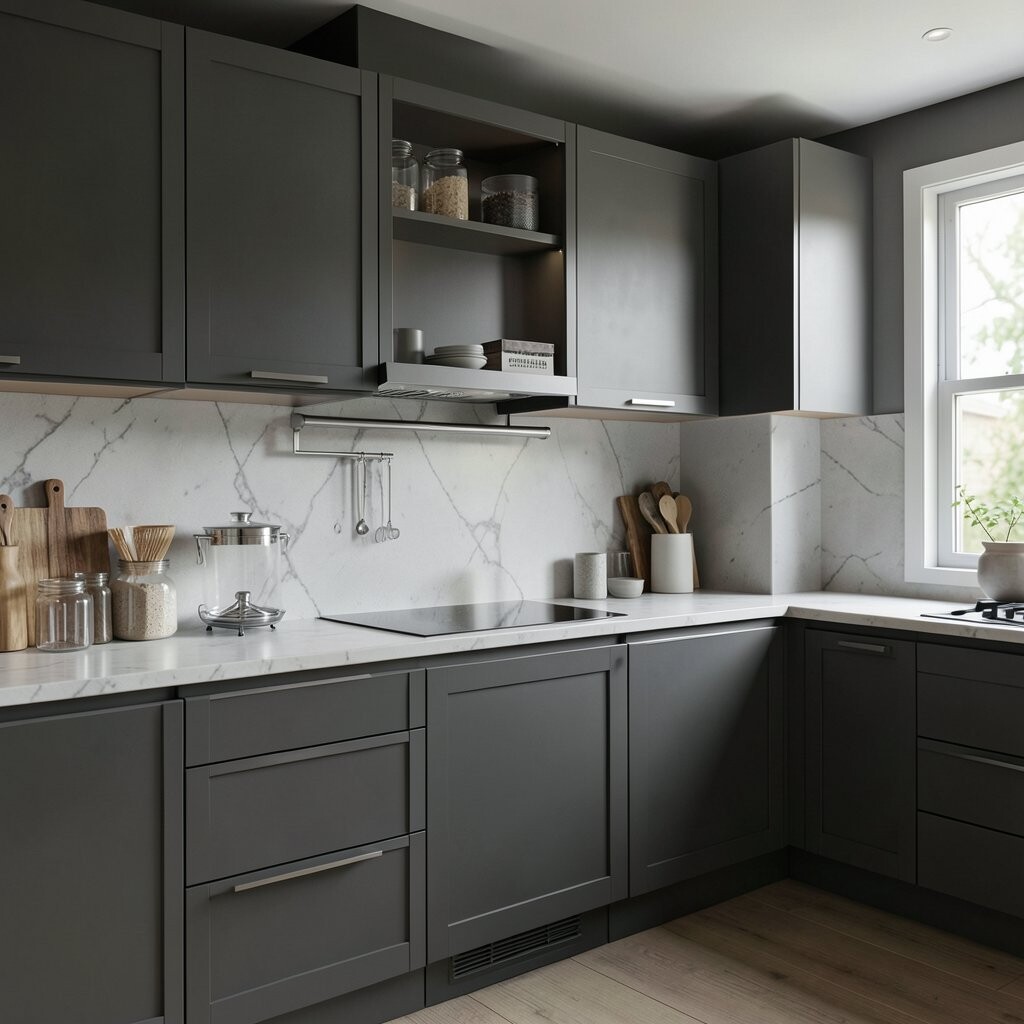 Moody matte layers use dark bins, deep shelves, and soft finishes for a rich, stylish feel. It gives cabinets a cool, grown-up look without being too loud.