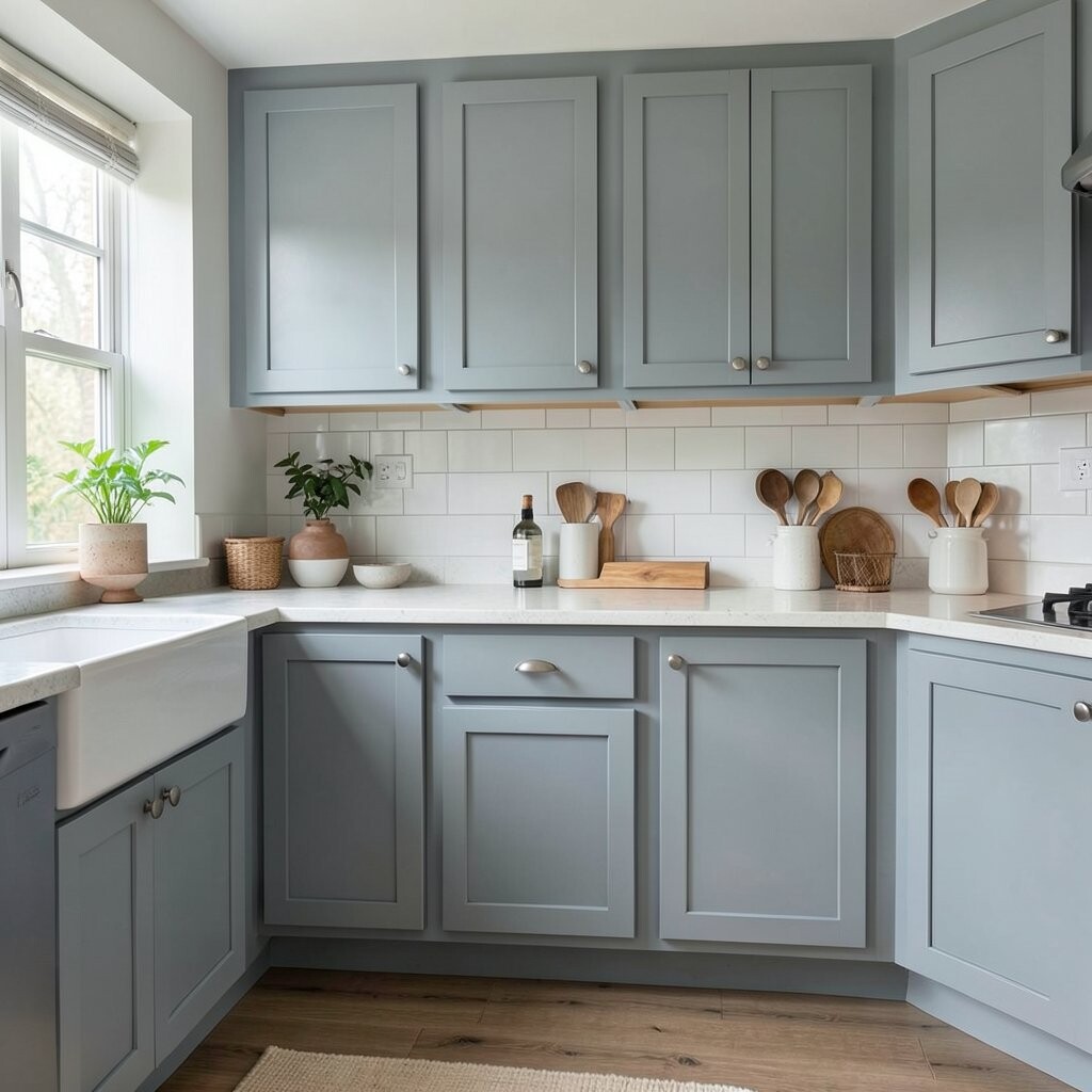 Blue-gray cabinets bring a misty, calm color that feels soft and peaceful. The shade changes a little in different light, which makes it interesting.