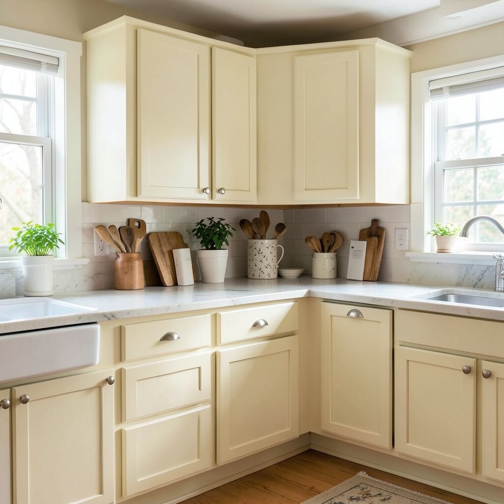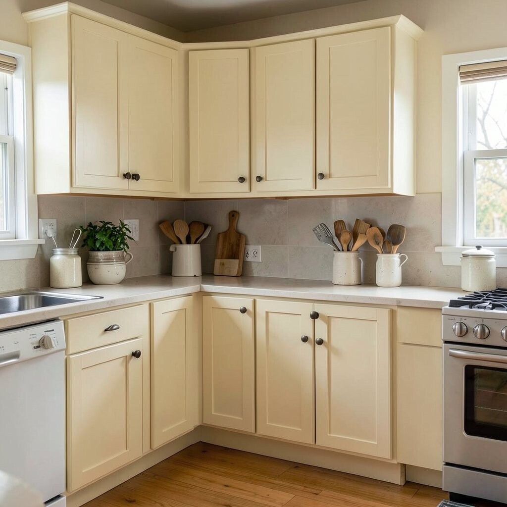 Buttercream cabinets have a rich, soft yellow tone that feels cozy and cheerful. They can make the kitchen glow in a very welcoming way.