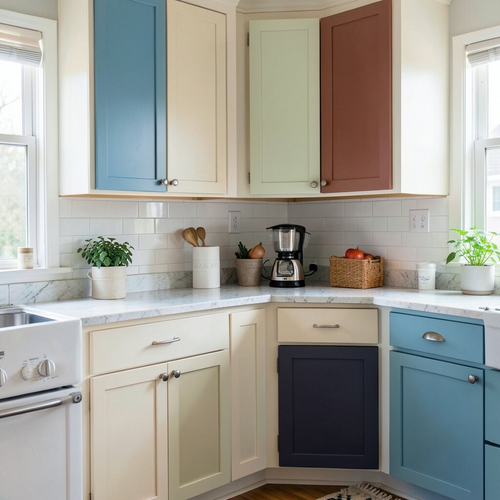 Use navy on the lower cabinets and a lighter color on top for a balanced look. Since dark paint may need extra coats, plan for a little more paint in the budget.