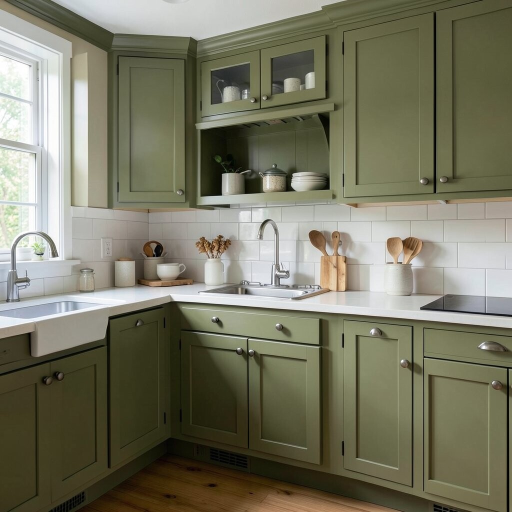 For a softer feel, use olive on just the island or lower cabinets. Paint costs stay manageable if you focus on one feature area instead of the whole kitchen.