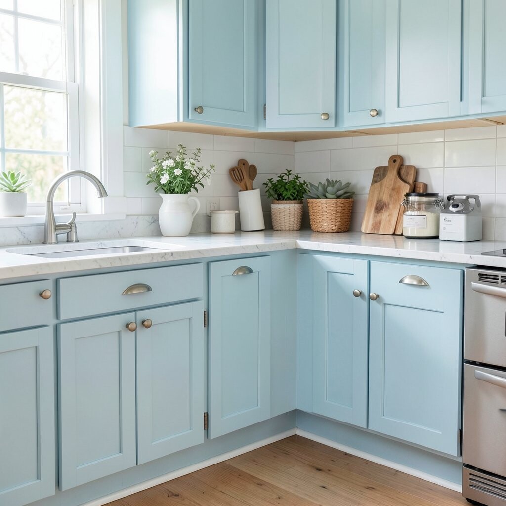 Pastel blue cabinets bring a soft sky-like feeling into the kitchen. The color feels cheerful, calm, and a little bit dreamy.