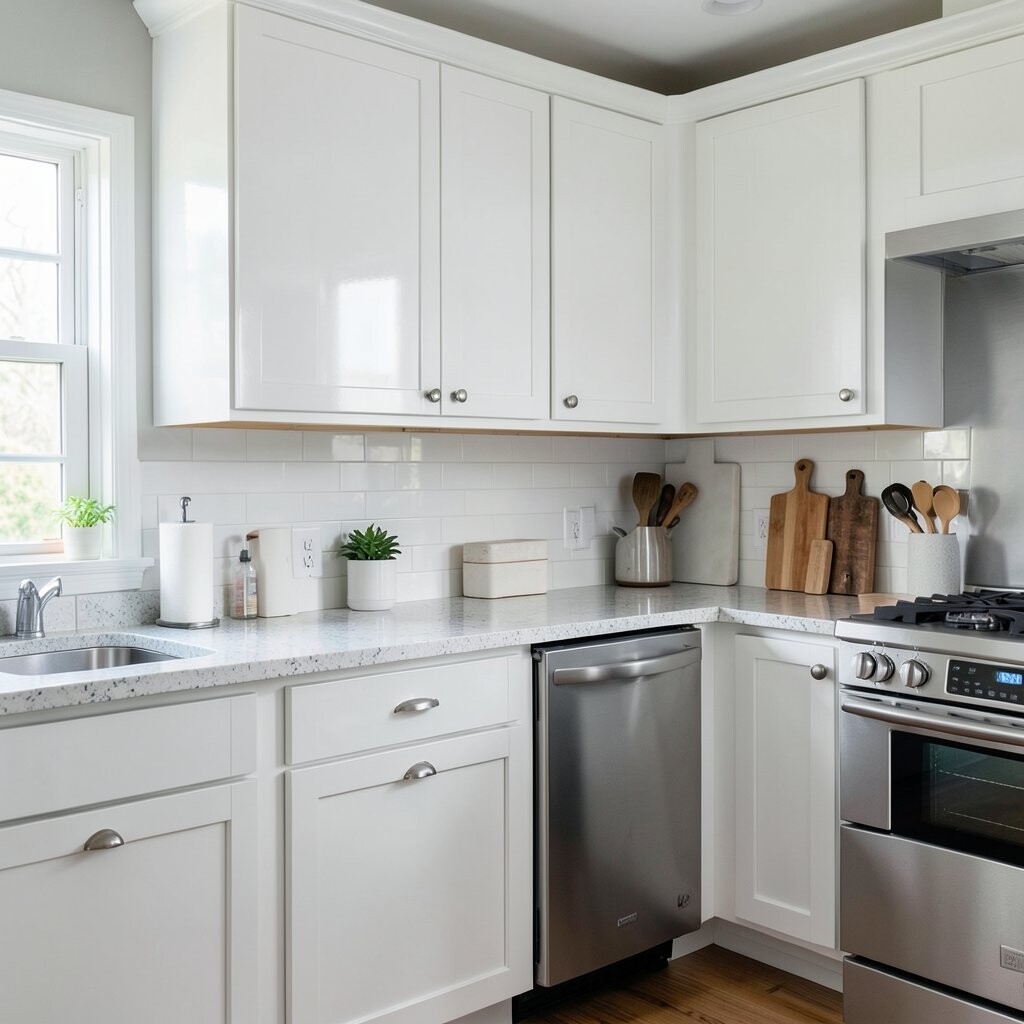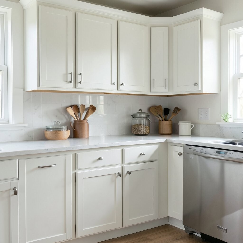 Soft white cabinets bring a light, airy feeling that makes a kitchen look neat and open. This style works well in small spaces because it reflects light and helps the room feel bigger.