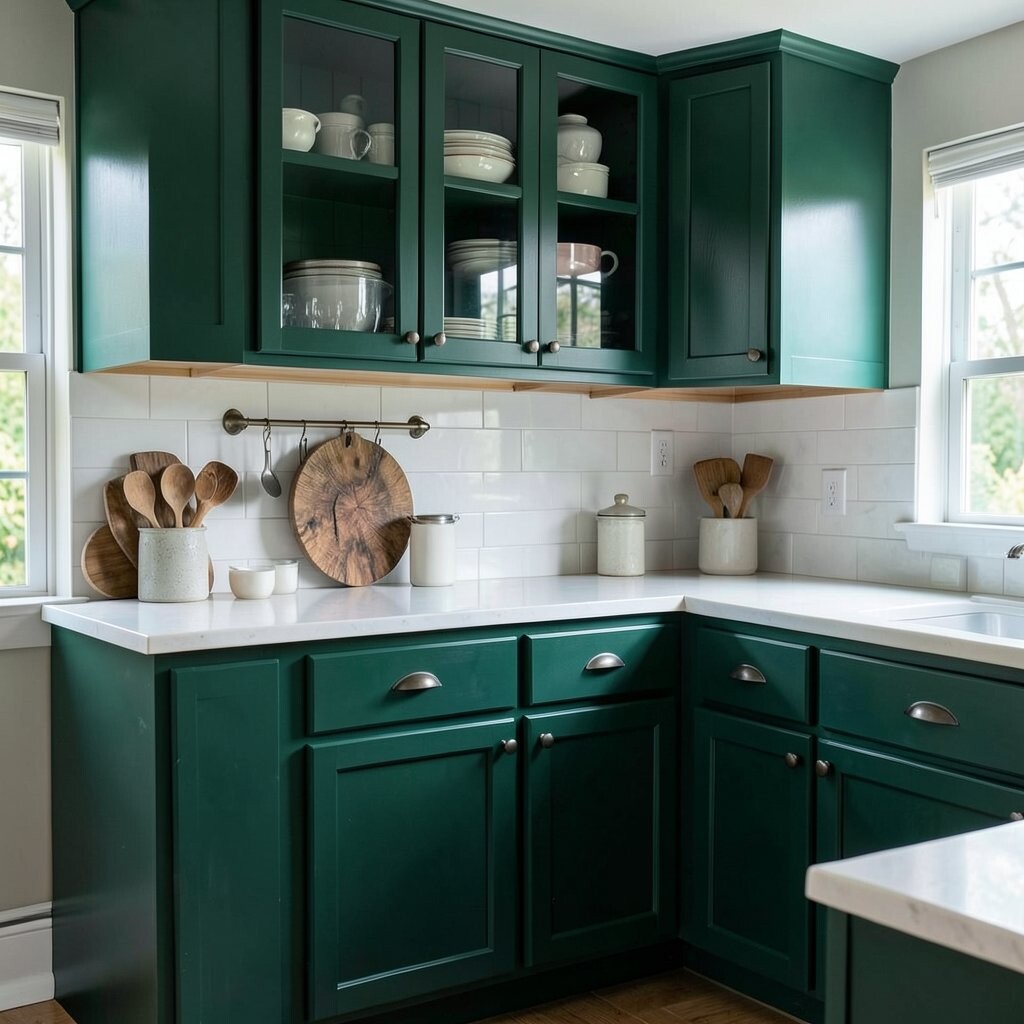 Forest green cabinets give the kitchen a deep nature look that feels calm and strong. The color brings a rich, elegant mood without feeling too fancy.