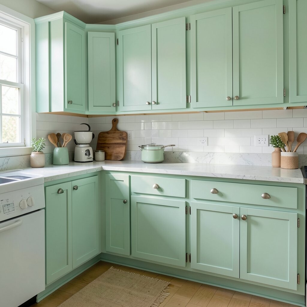 Mint green cabinets bring a cool, fresh feeling that can make the kitchen feel light and happy. The color feels clean and a little playful, like spring in a jar.
