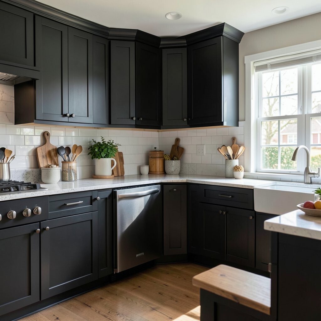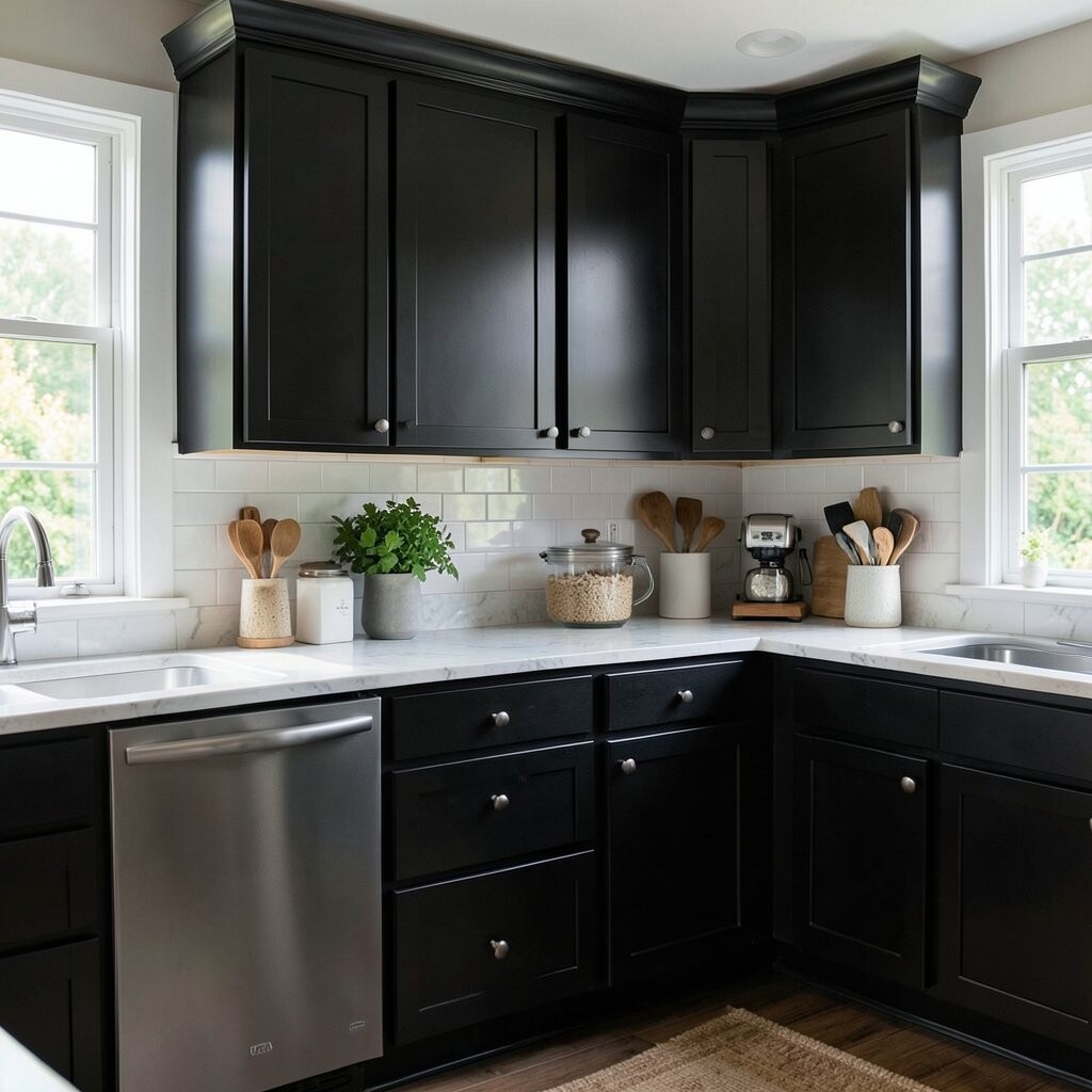 Use black on an island or lower cabinets if you want a smaller commitment. Because dark colors show dust, choose a wipeable finish and keep a microfiber cloth nearby.