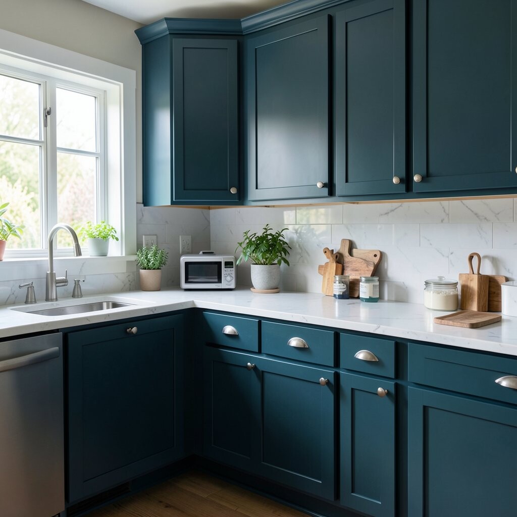 Deep teal cabinets bring a rich mix of blue and green that feels bold and beautiful. The color has a jewel-like shine that can make the kitchen feel special.