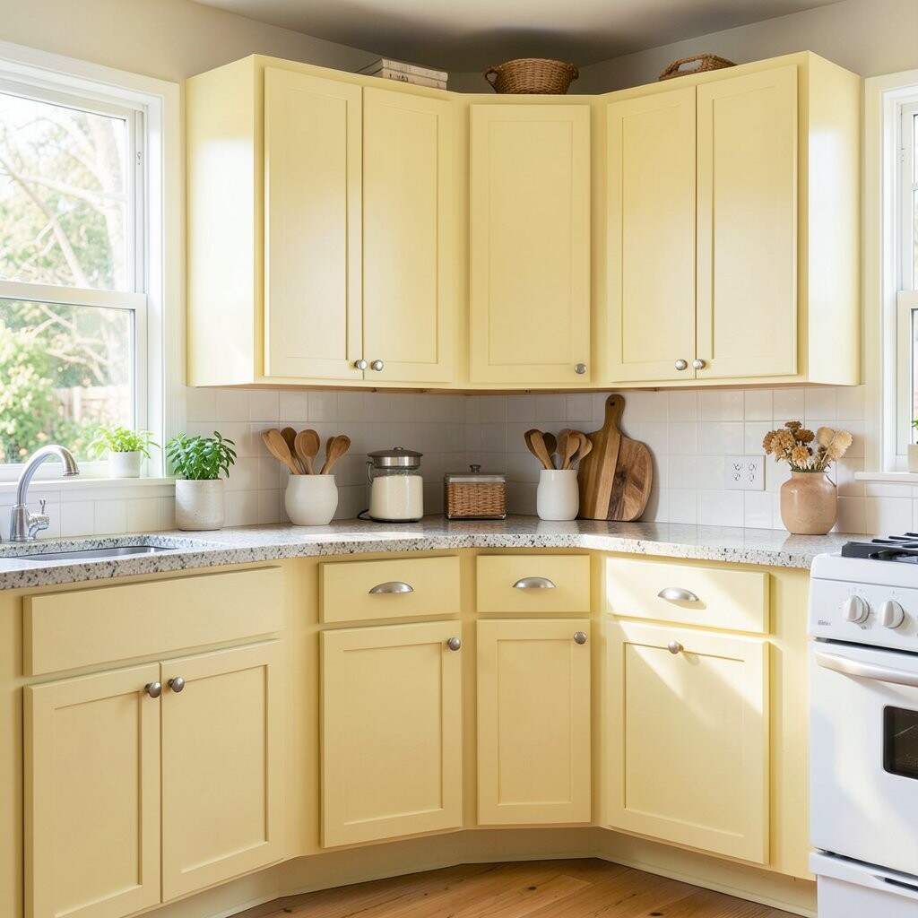 Pair pale yellow with white trim and simple glass knobs for a light look. Use a soft shade so the kitchen feels fresh instead of too bold.
