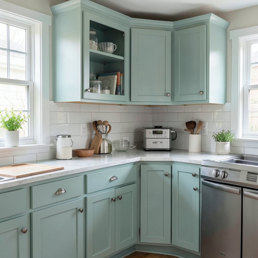 Pair mint with white shelves and glass jars for a crisp look. A soft finish keeps the color gentle and easy on the eyes.