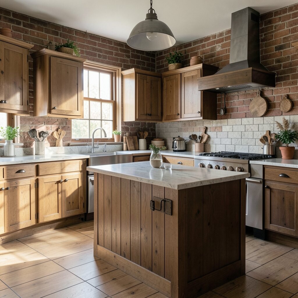 A rustic kitchen behind brick walls feels warm, earthy, and full of character. The rough texture of brick gives the room a cozy, old-world charm.