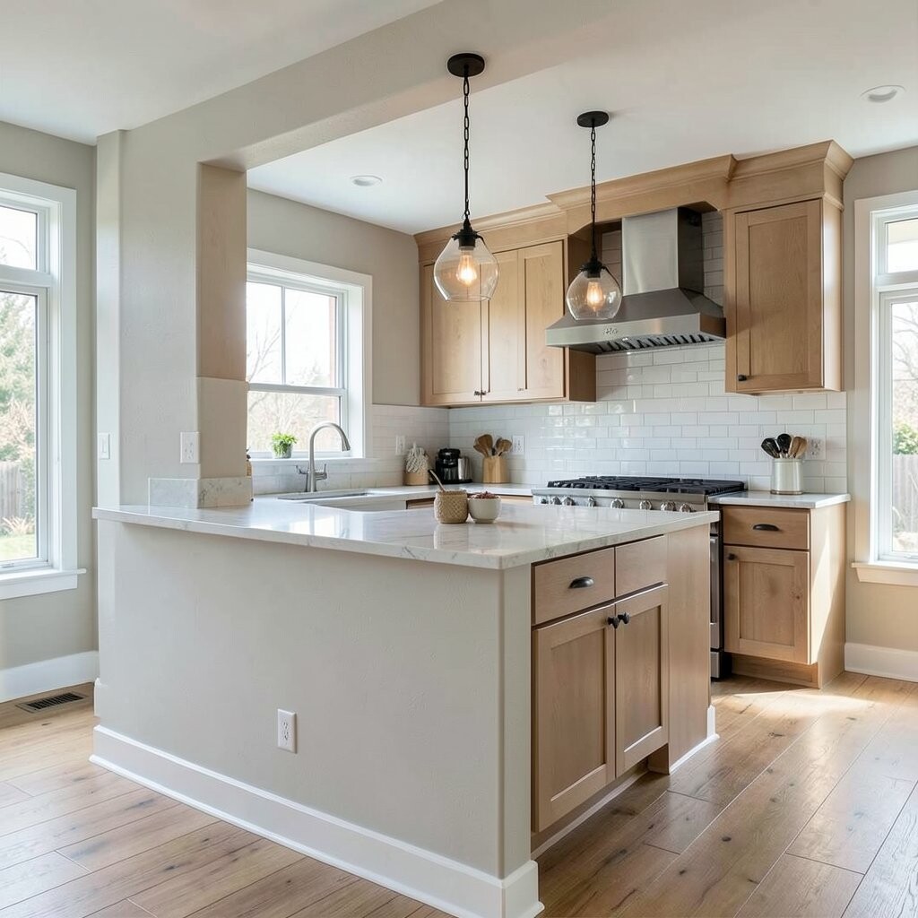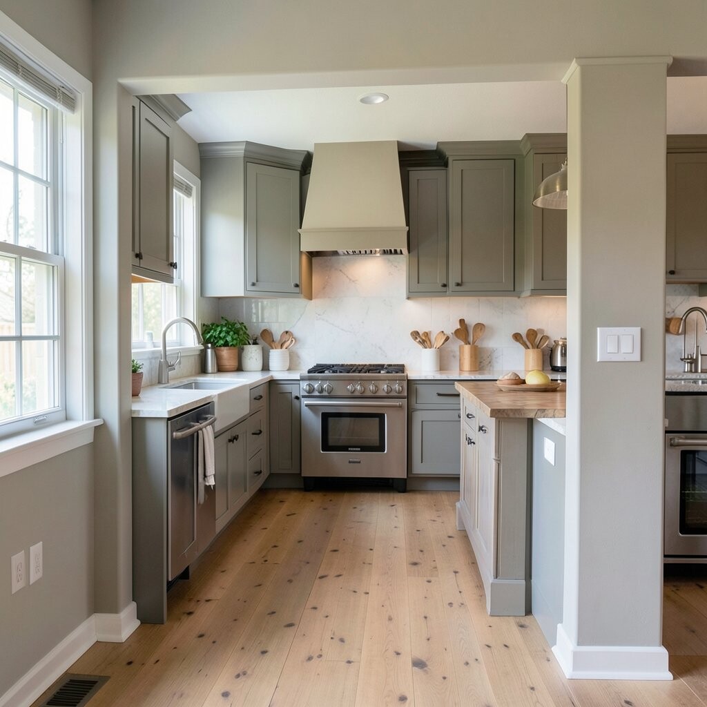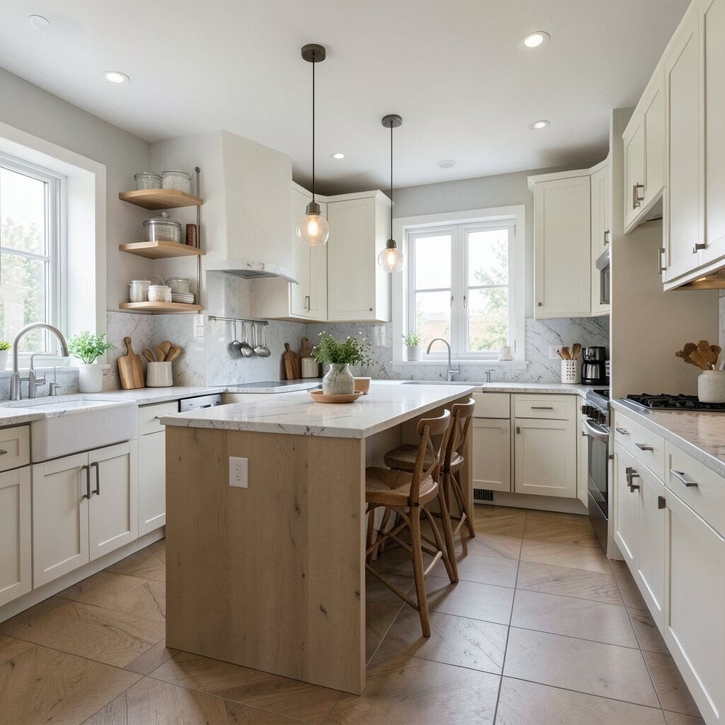 Use matching paint, slim pendant lights, and a clean floor pattern to make it feel polished. Costs can be moderate, especially if you keep the wall change simple.