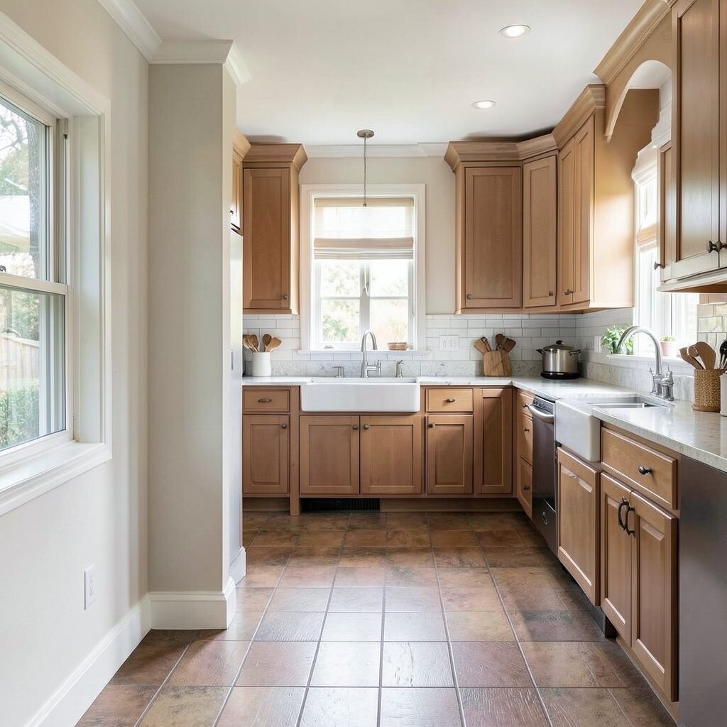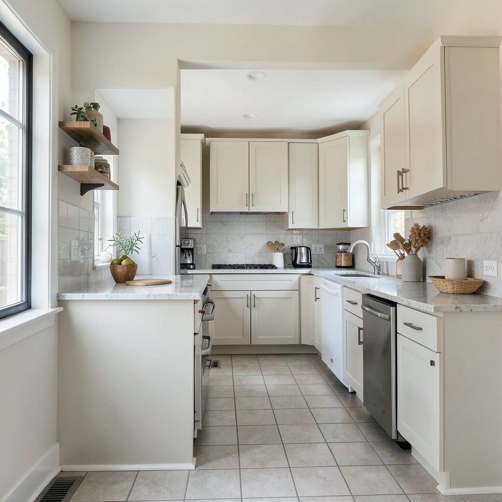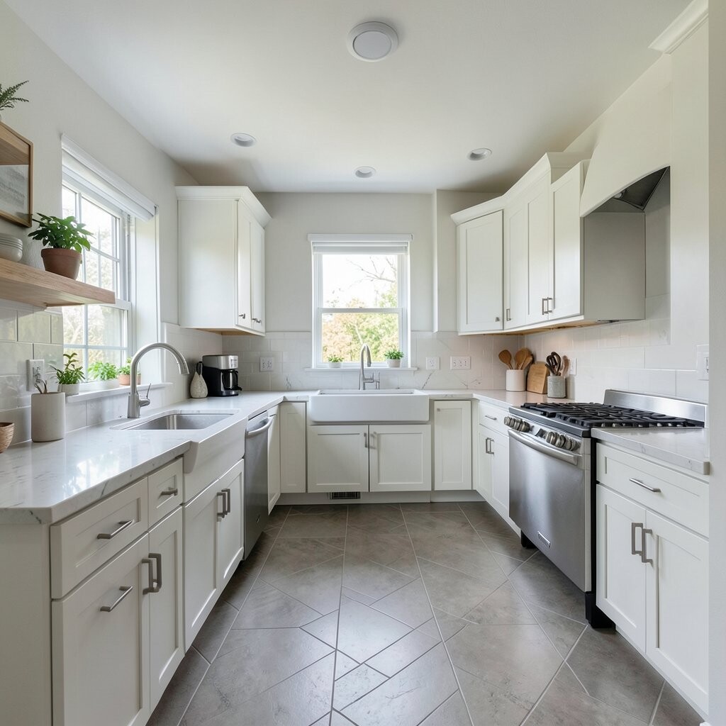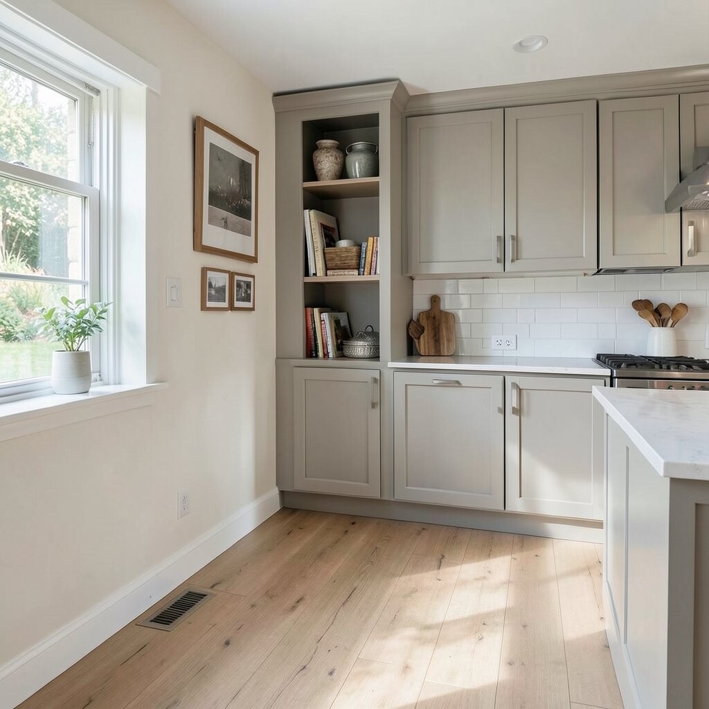 Use matching paint, slim pendant lights, and a clean floor pattern to make it feel polished. Costs can be moderate, especially if you keep the wall change simple.