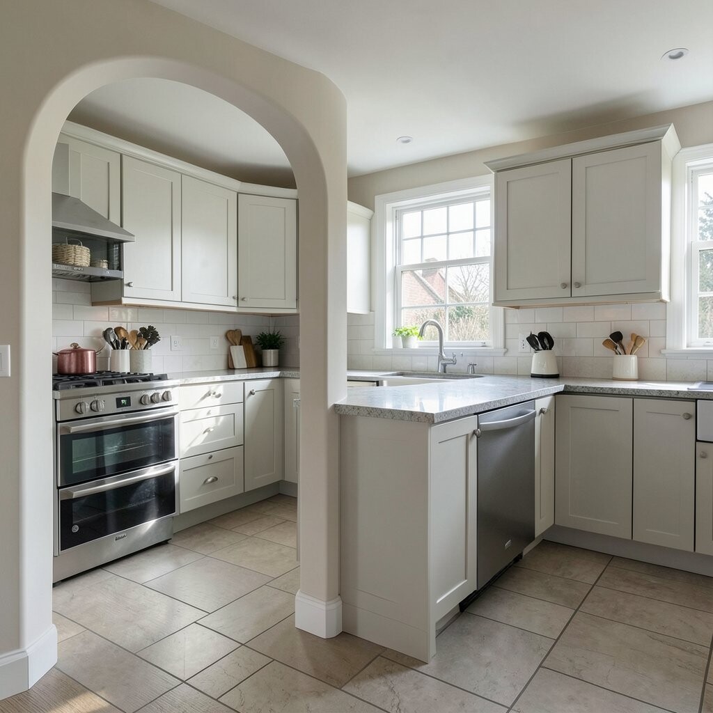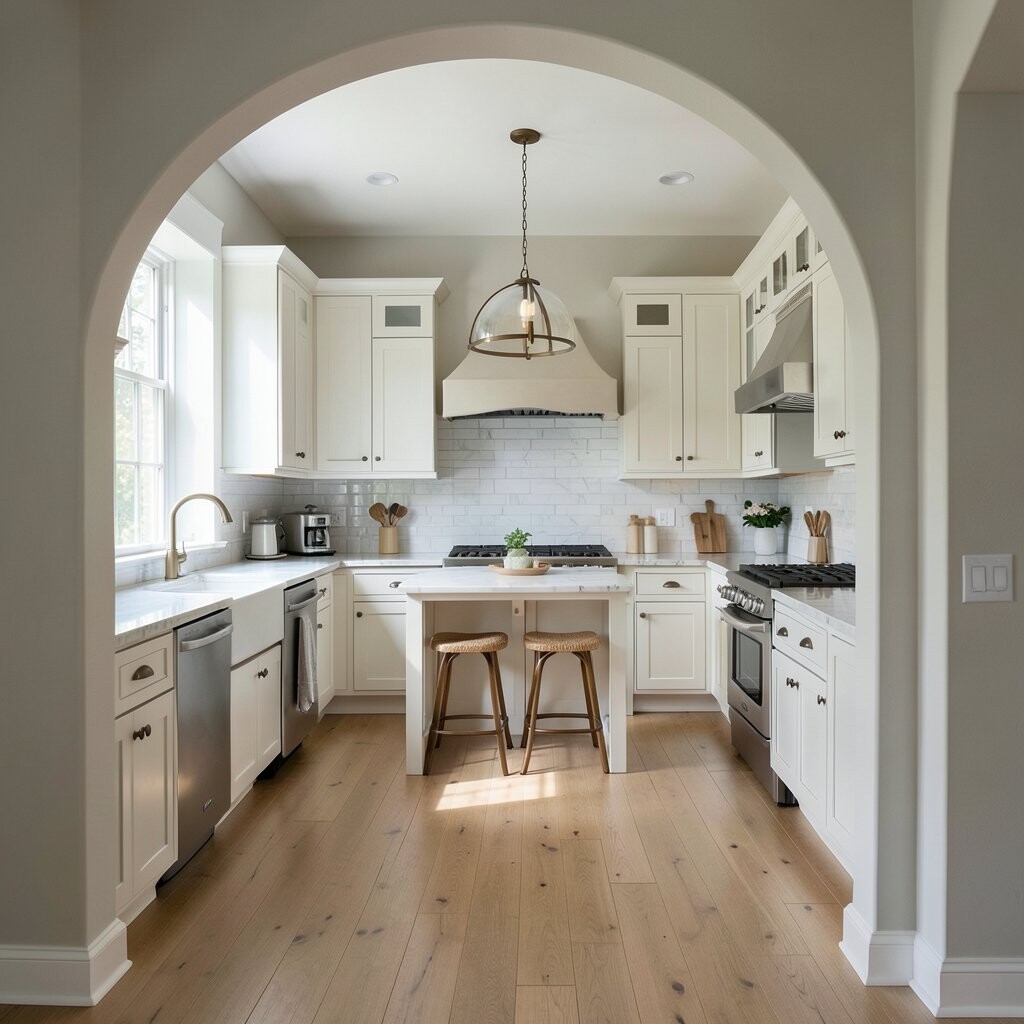 Pair the arch with marble-look counters, soft gold hardware, or creamy tile. The cost may be higher if the arch needs custom building or careful finishing.