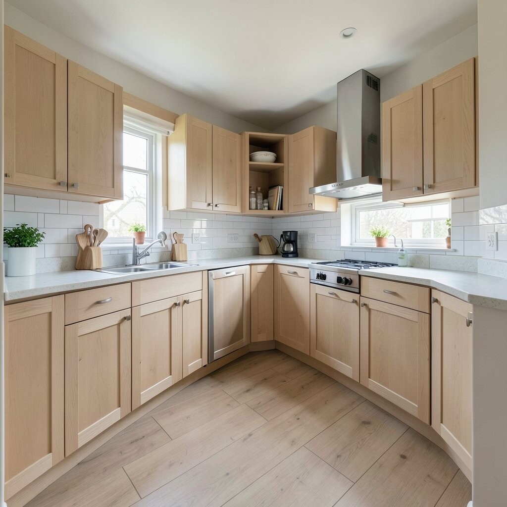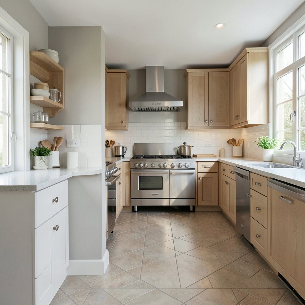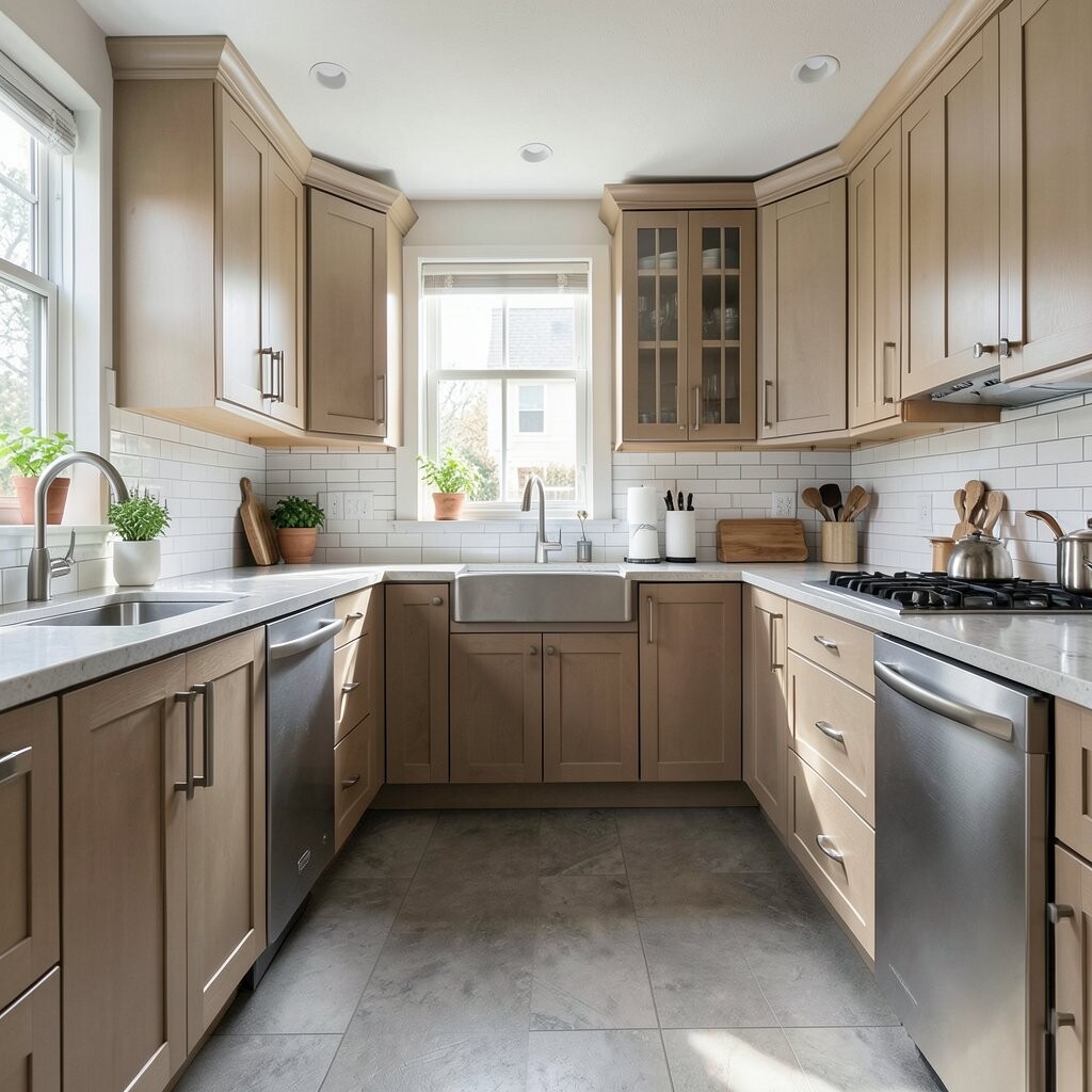 For a modern touch, use open shelves on one side or glass cabinet doors. This plan can cost more than a simple galley because it uses more cabinets, but it often feels worth it.