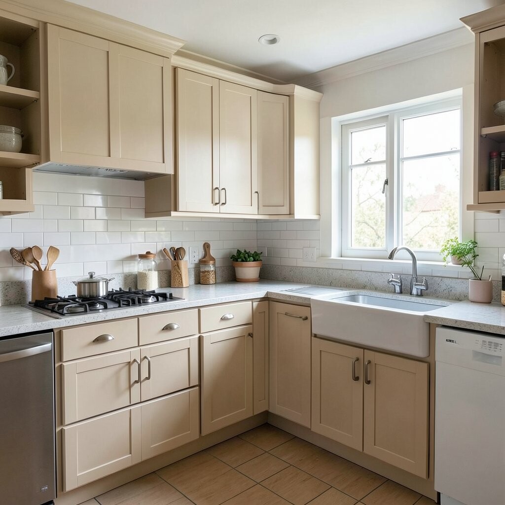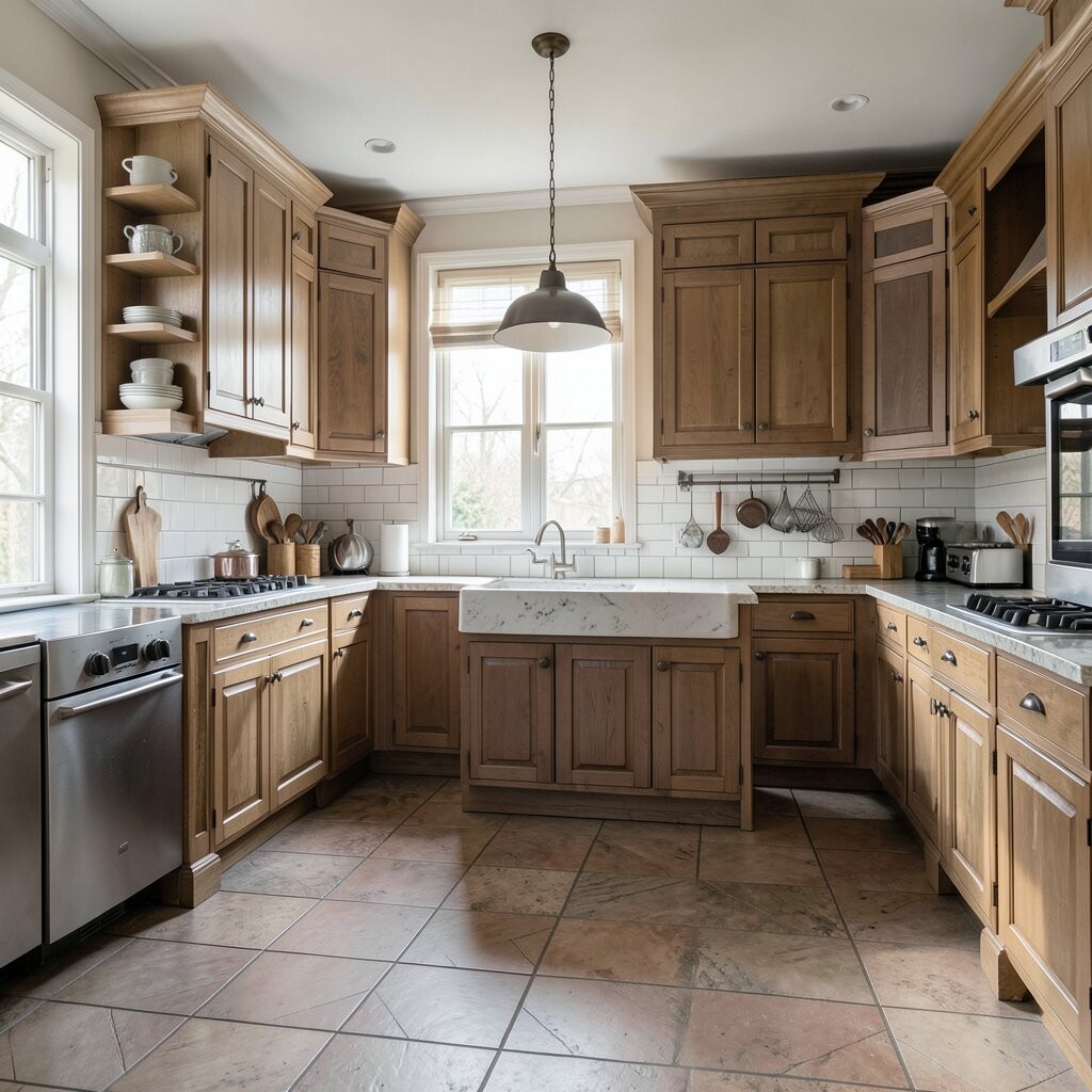 Mix in apron sinks, shaker cabinets, and open shelving for a sweet country feel. Costs can stay moderate if you choose simple finishes and classic pieces.