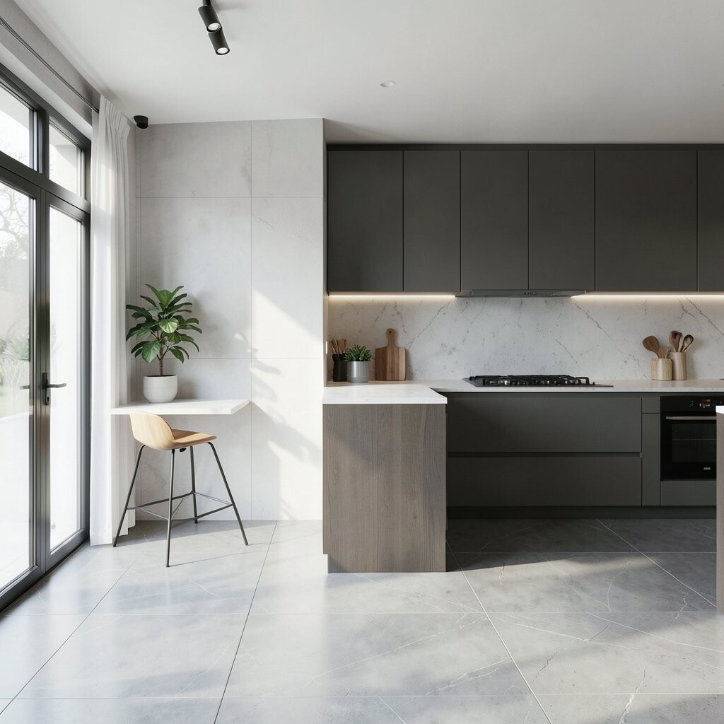 A sleek kitchen behind a hall wall can feel very smart and stylish. It uses a hallway edge to hide the cooking area, which makes the home feel organized and calm.