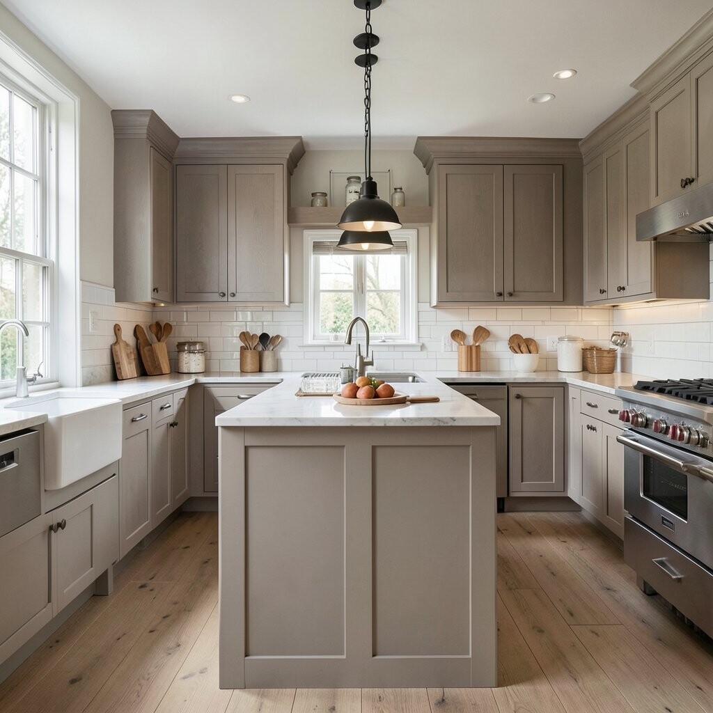 A farmhouse kitchen behind a painted wall feels friendly and relaxed. White or soft gray walls can make the room feel bright, while wood touches add that cozy farmhouse charm.