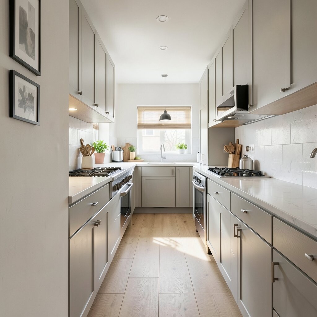 A galley kitchen tucked behind a wall feels neat, smart, and easy to use. Two long counters face each other, which makes cooking feel smooth and simple.
