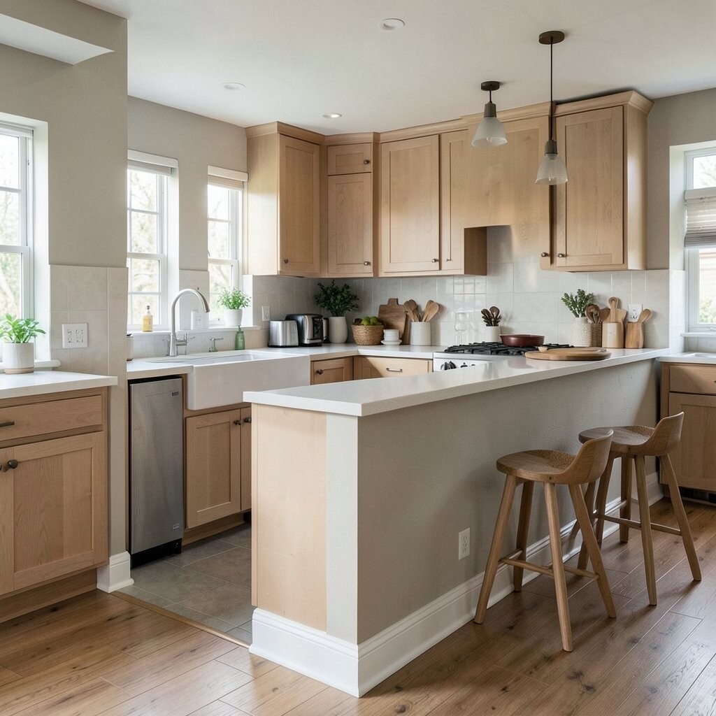 Add bar stools, a pretty backsplash, or a warm wood shelf on the half wall. The cost is often mid-range, and the look can feel very current and homey.