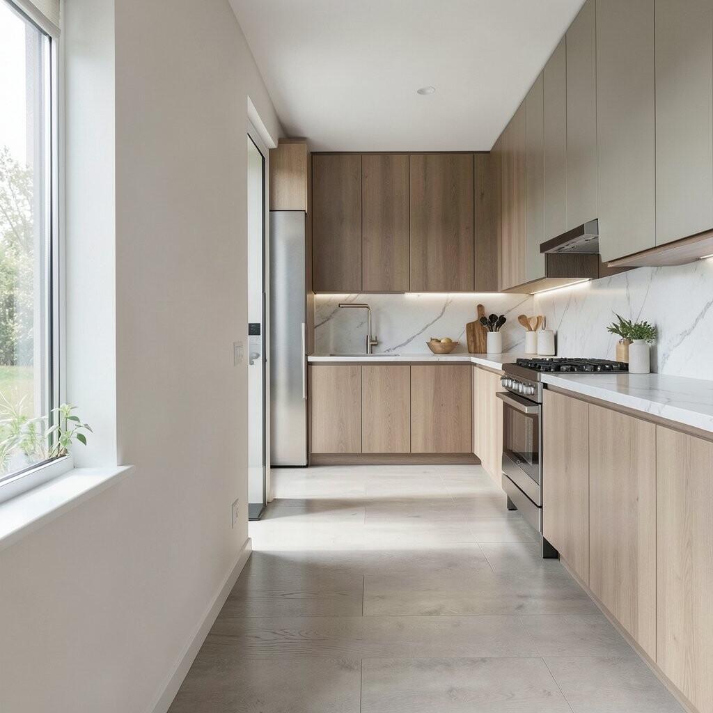 This layout is good for narrow homes or apartments with tricky space. It can help the kitchen feel tucked away without losing easy access.