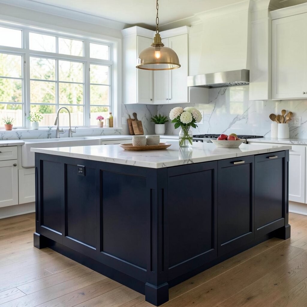A bold navy island adds a deep, rich color that feels stylish and a little dramatic. It looks lovely with brass handles, white counters, and soft wood floors.
