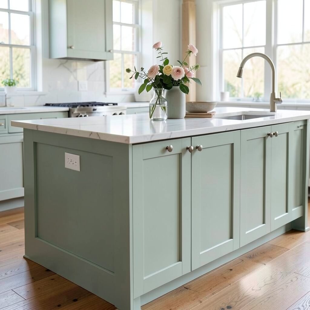 A soft sage island brings a calm, fresh feeling to the kitchen. The color feels gentle and natural, like a pretty leaf in spring.