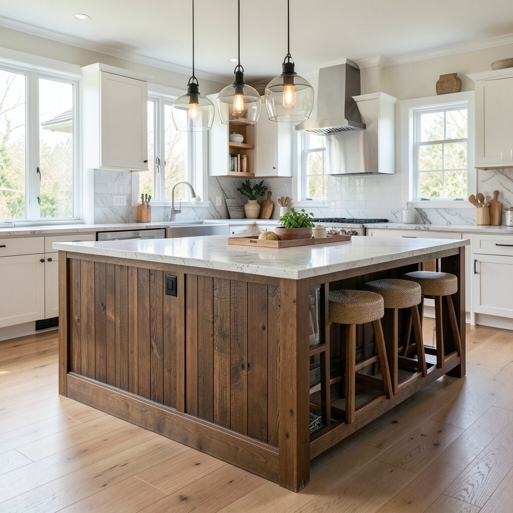 A mixed-material island blends two or more finishes, like wood and stone, or metal and paint. This mix makes the island feel custom and full of personality.