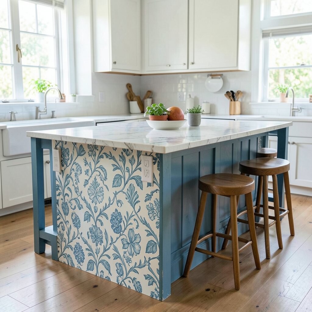 An island with a painted pattern adds a fun, artistic touch that feels personal and bold. Stripes, checks, florals, or tiny shapes can make the island feel like custom art.
