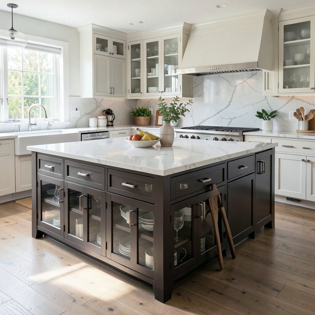 An island with glass cabinets adds a light, fancy feel and lets you show off pretty dishes or glassware. The clear doors make the island look open and elegant.