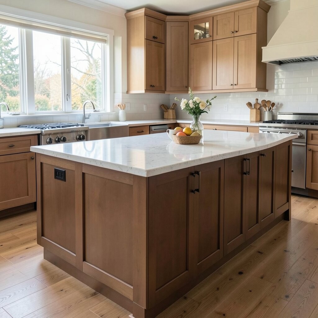 A warm wood waterfall island brings a soft, rich look that feels calm and inviting. The wood grain flows down the sides, so the whole piece looks smooth and fancy without trying too hard.
