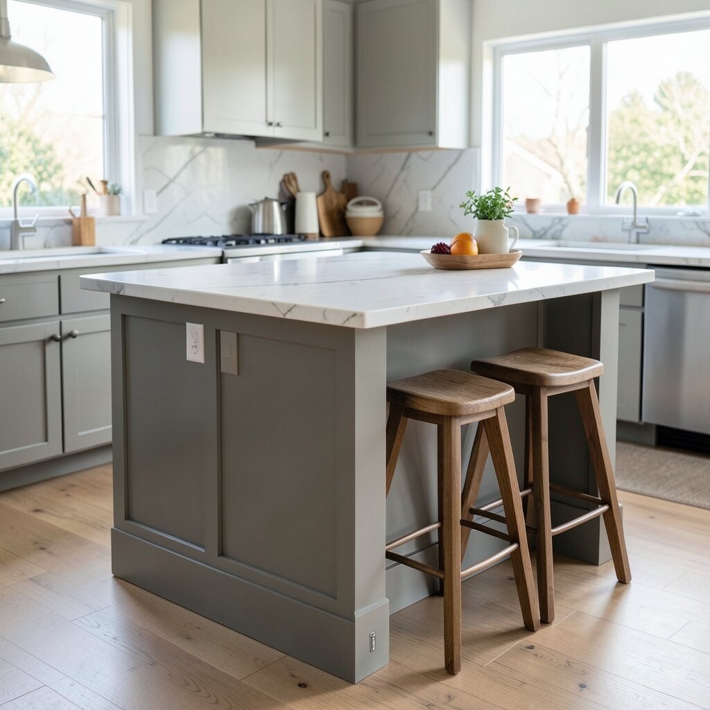 Use satin paint for a smooth finish and pair it with light stools to keep the space balanced. Cost can stay friendly if you paint an old island instead of buying new.