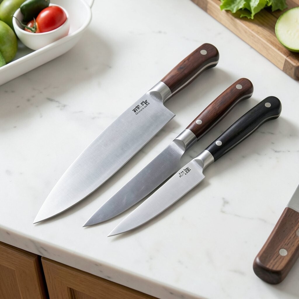 Look for matching handles or matching blade finishes for a neat look. Many starter sets cost around $30 to $70, which is often less than buying one fancy knife.