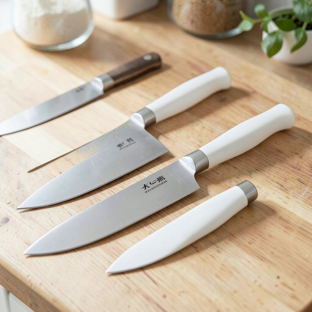 A white-handled Japanese knife can look crisp, bright, and very clean. It gives the kitchen a fresh style that feels calm and modern.