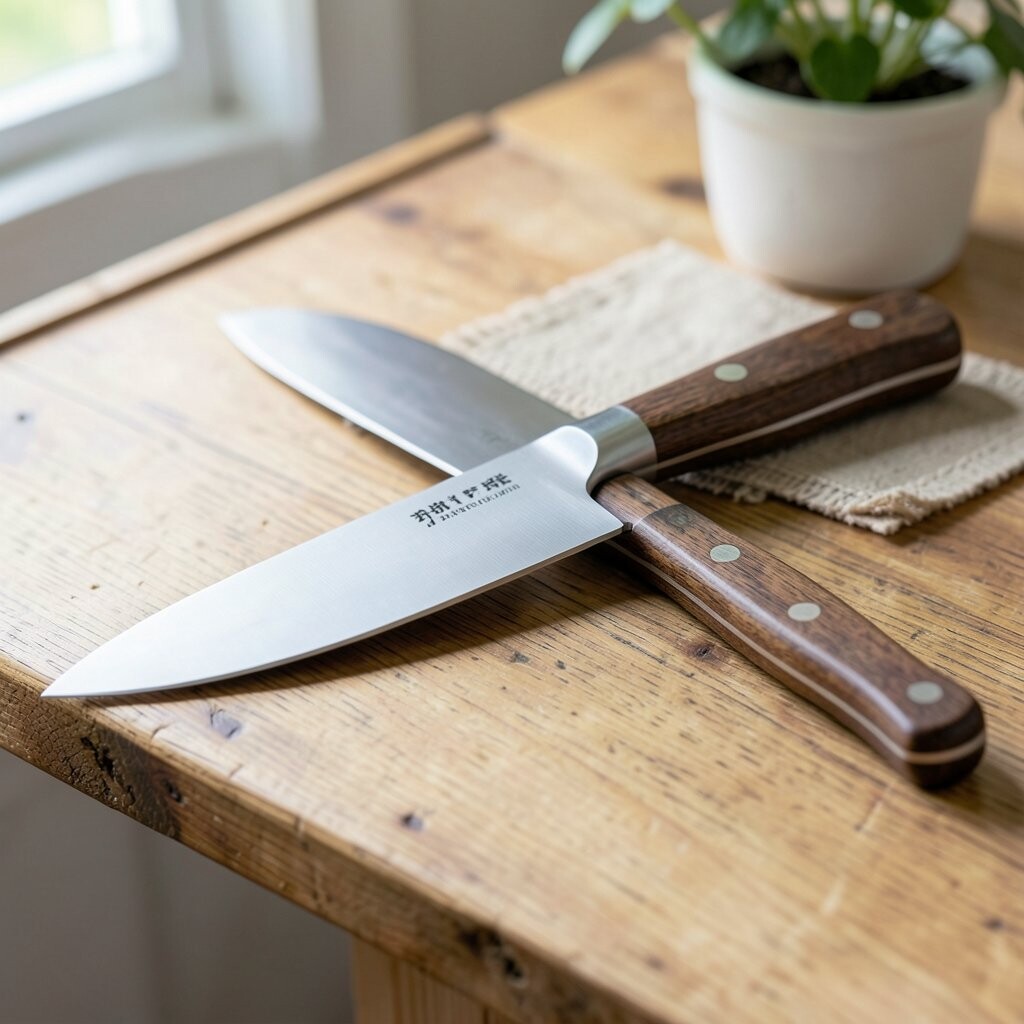 The santoku is a friendly all-around knife with a neat, compact shape. It looks sleek on a wooden board and feels light in the hand, which is nice for daily meals.