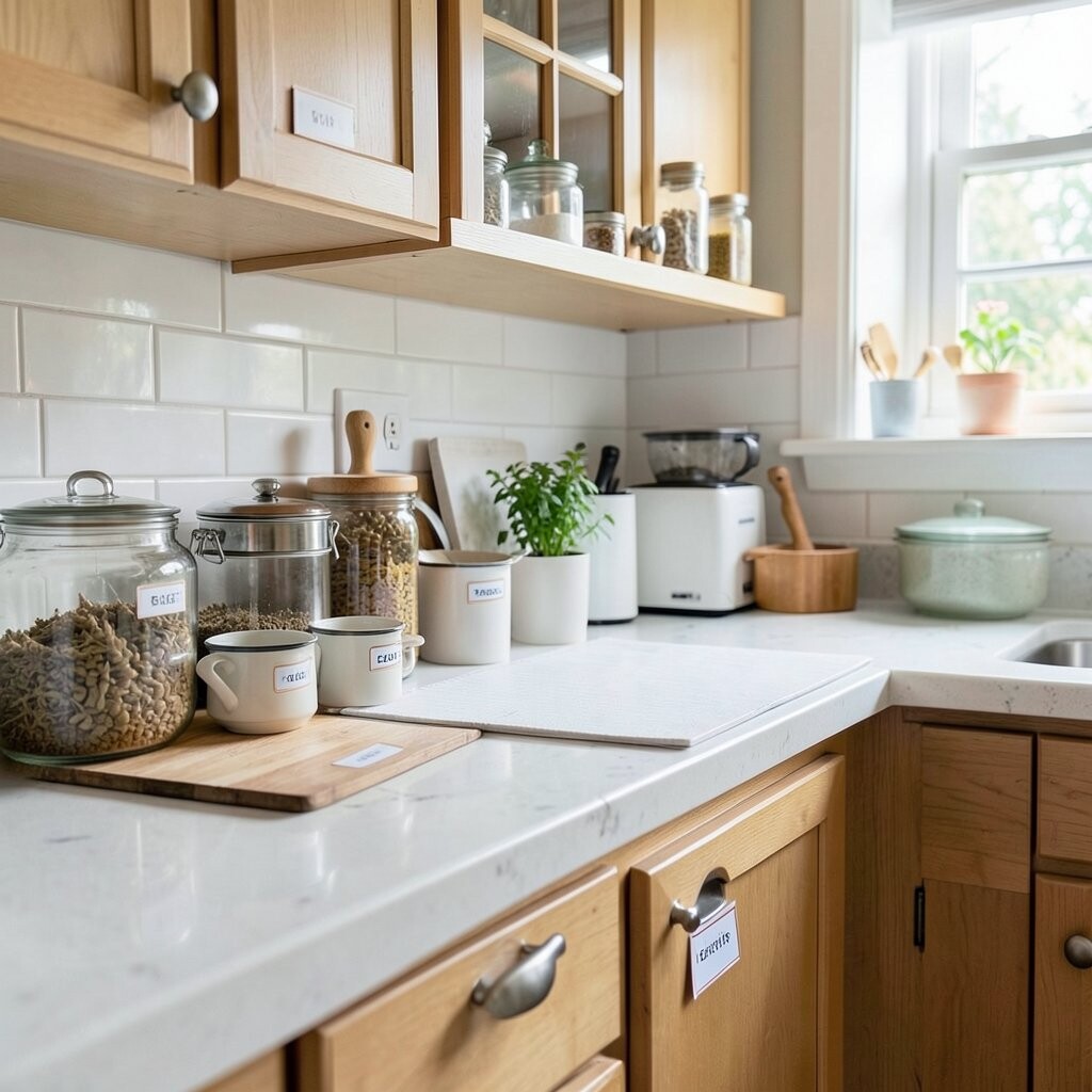 This idea is perfect for maintaining order and clarity. Choose from a variety of label styles to match your kitchen’s aesthetic. It’s an affordable solution that brings both style and practicality to your space.