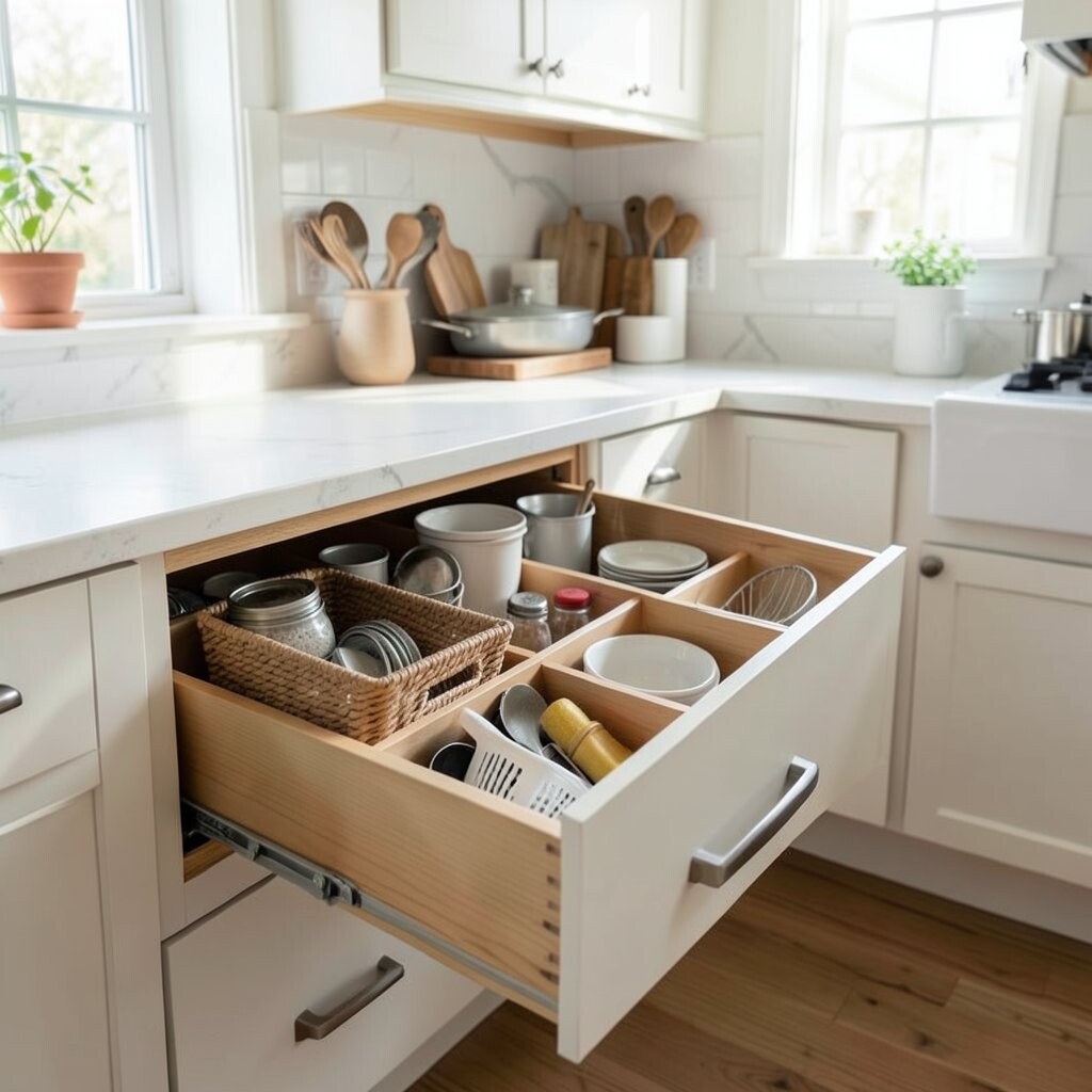 Customizable drawer inserts keep your kitchen drawers neat and tidy. They let you create specific compartments for utensils, gadgets, and more, preventing clutter and chaos.