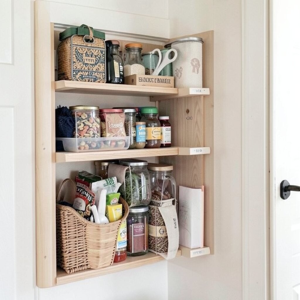 An over-the-door organizer is a smart way to add storage without taking up extra space. It hangs on the back of your pantry door and has multiple pockets for snacks, spices, and other small items.