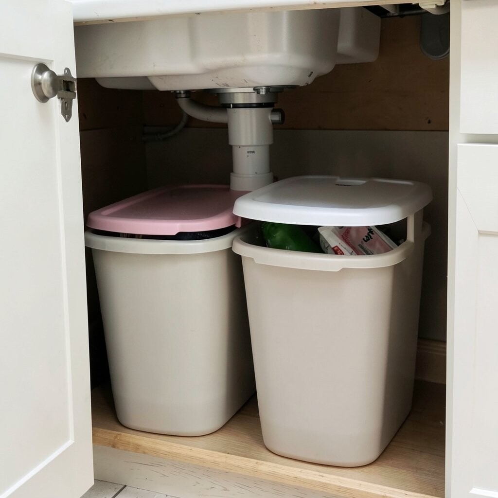 Pull-out bins are a sleek way to handle trash and recycling. They hide away inside a cabinet, keeping your kitchen looking neat and tidy. With separate compartments, sorting is a breeze.