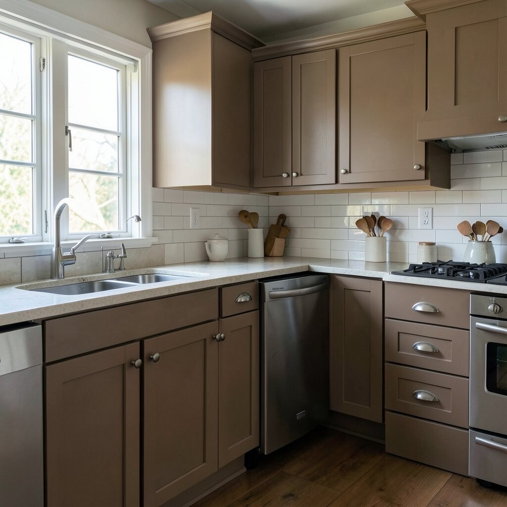 Mushroom brown is a soft, muted brown-gray that feels calm and modern. It gives the kitchen a grounded look that feels easy to live with.