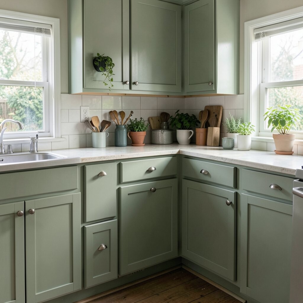 Sage green brings a soft nature look into the kitchen. It feels peaceful and cozy, like a little garden corner inside the home.